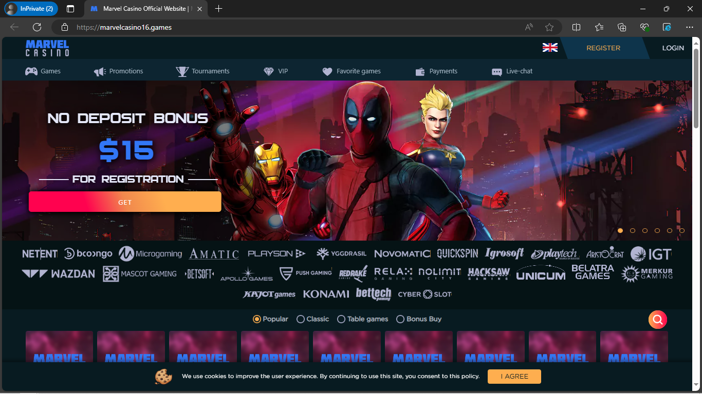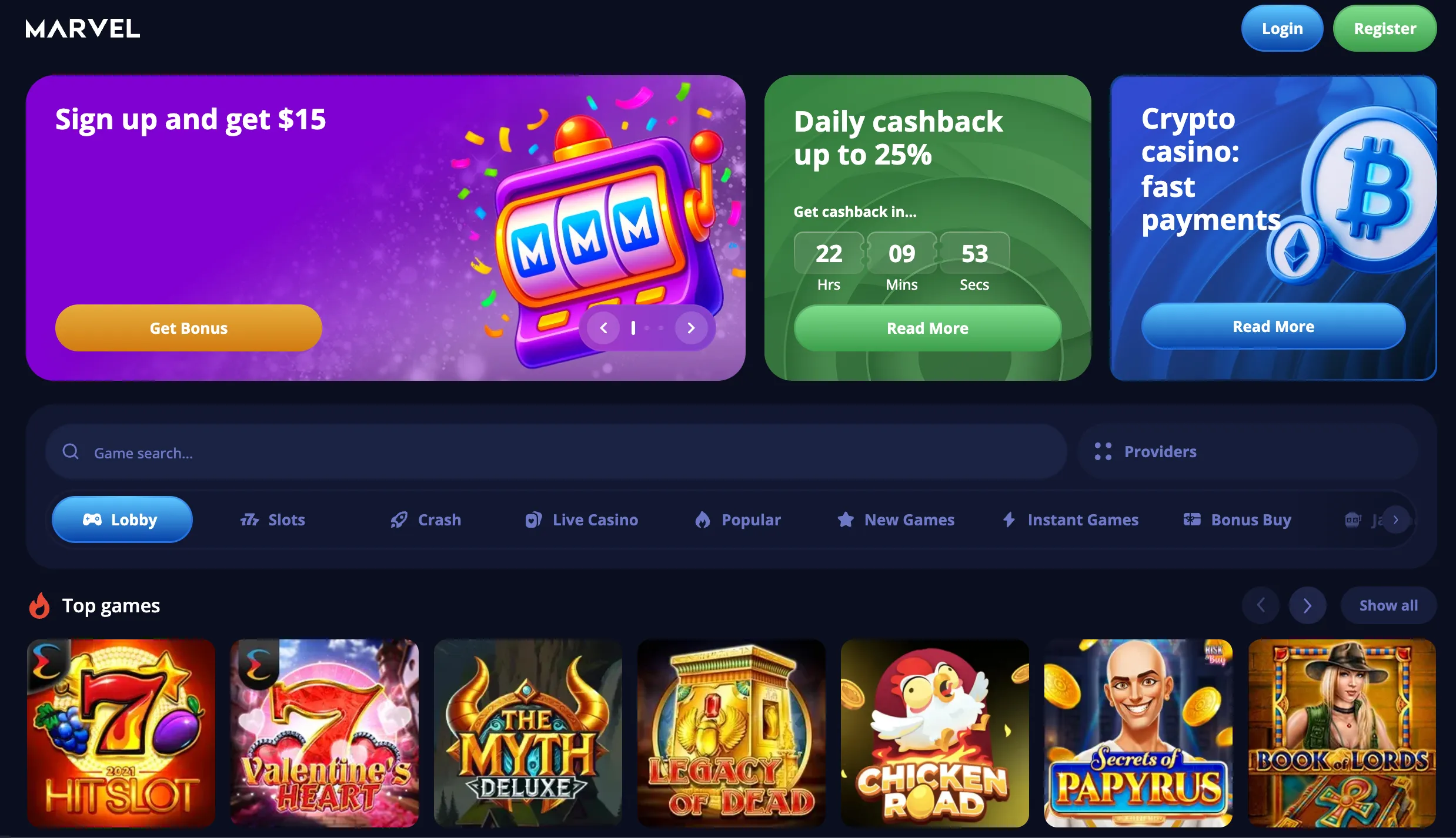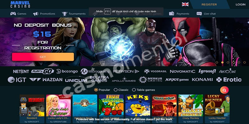 Marvel Casino — 250% bonusu od pierwszej wpłaty z kodem FD1 albo 150% + 100 Free Spins z kodem FD2 oraz 15 $ bonusu bez depozytu po rejestracji